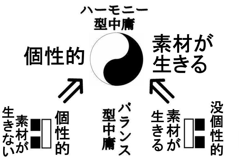 それに対して、素材を正しく理解し、自分の個性となる酵素をもち、それを寝かせることで正しく発酵させるというただしい過程を経た発想は図の上の「ハーモニー型中庸」なり、個性的でありながら素材が生きる。個性的でありながら良い意味で没個性的であるすぐれた作品になる。